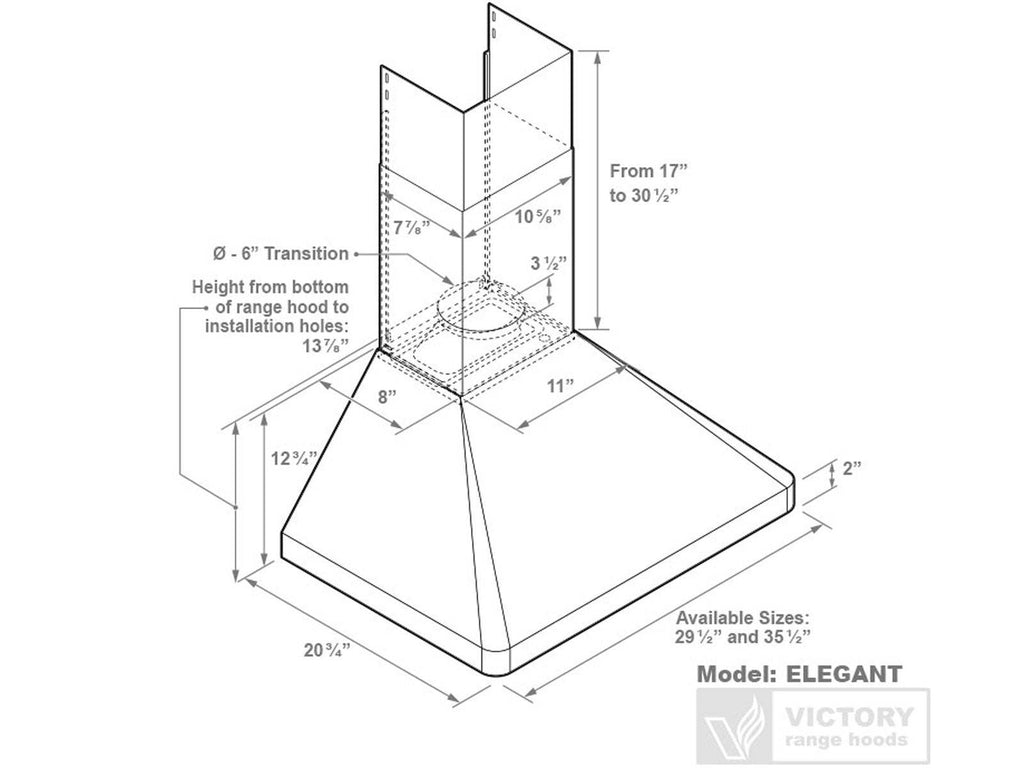 The most reliable chimney range hood on the market. VICTORY Elegant is an easy to install range hood and is endlessly reliable. This wall mounted range hood hood comes with bright LED Lights and Mechanical Switches to create an unparalleled cooking experience. Unlike other range hoods, the VICTORY Elegant has a lifetime motor warranty. Looking for a reliable range hood? Choose the VICTORY Elegant 36" for all your range hood needs.