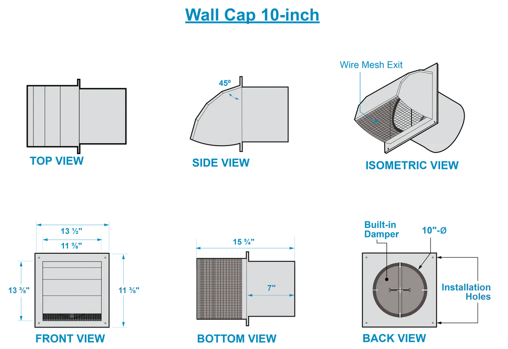 Easy Installation: Simple, straightforward wall-mount cap that fits standard 10″ round ducting for range hoods and exhaust systems.